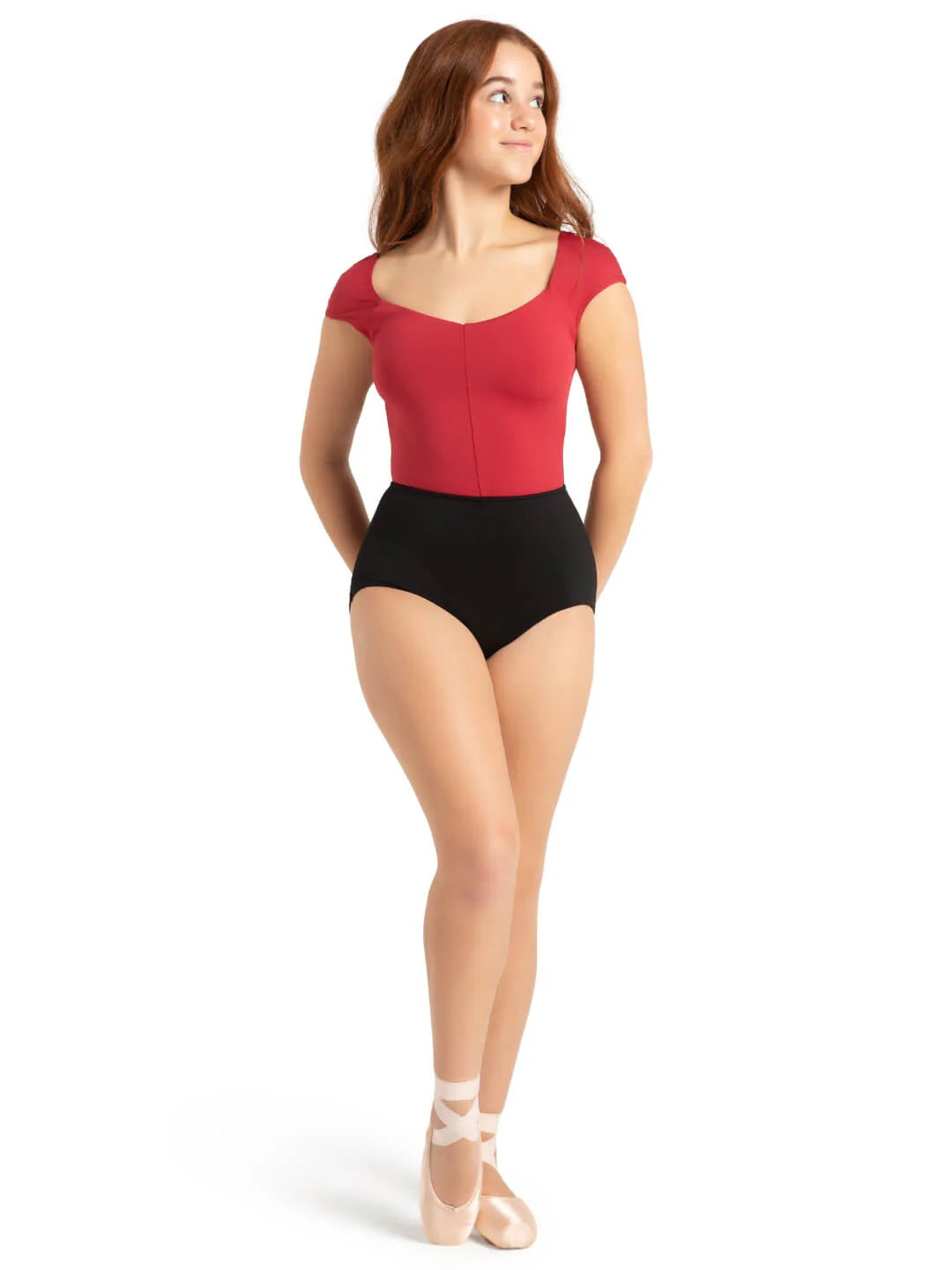 Meet the Jolie Leotard, the ultimate fusion of elegance and flair. Made of a soft polyester and spandex blend, this fully front-lined leotard keeps you comfortable and feeling chic with every step. The raglan cap sleeves give you full arm freedom, while the v-front adds a touch of sophistication. The center front seam creates an alluring shape, highlighting your waist for a sleek and elegant presence. The deep v-back adds a touch of panache, while the natural waist seam keeps the leotard secured throughout every class. Pair with the Bijou Skirt or Enchante Bike Short to complete the look. Available in both adult and child sizes.
