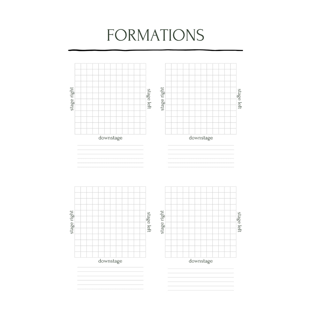 Choreography notebooks with space for: notes, counts, cast, music, formation grids, costume planning, sketches and more.