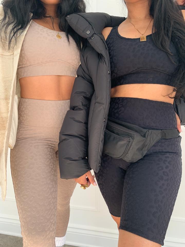 These Espresso biker shorts scream high quality. Made using exclusive textured Leopard Jacquard, the print is discreet but take a closer look and you will see the raised leopard texture creating a unique 3D tonal feel. Keep your activities hands-free with the discreet phone pouch on the waistband. The inner lining ensures your comfort and security when moving. This high quality set was made for artists, fitness and fashion lovers. The fabric is stunning and you will never want to take this off. Limited Quantity. Pair with the matching Espresso Sports Bra.