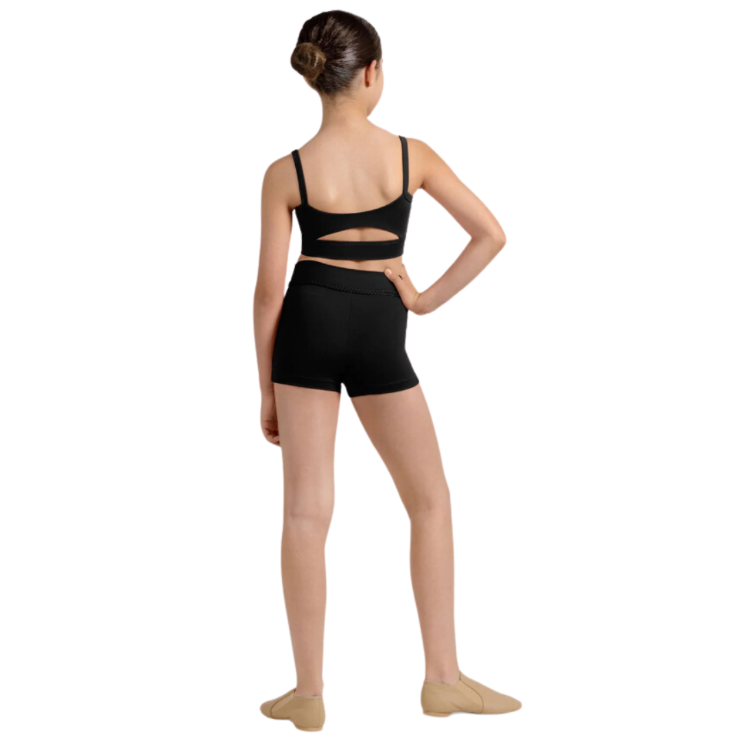 Our Girls Mirella Miami Print Top features a scoop neck and camisole straps with a cutout back detail and wrap over underbust band for a secure fit. Pair with our V Front Shorts or V Front Jazz Pant for your perfect dance ensemble. Part of our Mirella Miami Collection; this collection of super-cute dancewear features braided trims, eye-catching shades, and shiny gold details for a touch of show-stopping sparkle.