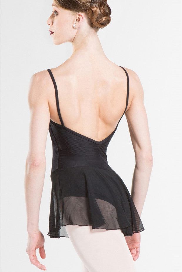 A beautiful, ethereal camisole dress with front lining and unique super slimming detail on the sides and back. Four way stretch mesh attached skirt.