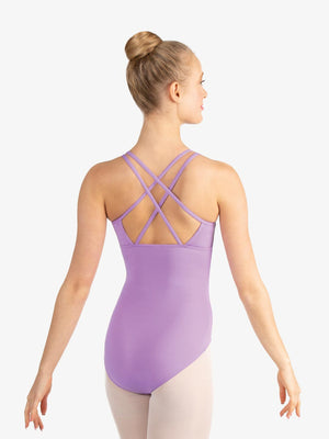 V-front camisole leotard featuring double straps that begin at the shoulders and travel down the back creating a criss cross design.